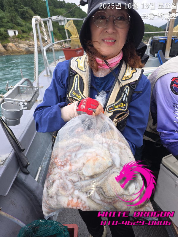 |   #문어낚시 #새벽문어 18일 토요일 조황 바람이 심하게 많이 부는 하루였습니다 ㅠ 초보자 분들도 여러분 계셨지만 꽝없이 잡긴하였지만 역시 실력차가 있다보니  조과는 편차가 있었네요... 장원 18개 17,15,12,9개 순으로 배전체는 120수 정도 하였습니다  바람부는 가운데 포인트 진입도 힘든 상황에 열심히 낙시해주신 분들께 감사드립니다 예약문의 010-4629-0806  ===고흥 백룡호 예약안내 === 예약문의 : 010-4629-0806 오시는길 : 전남 고흥군 도양읍 봉암리 2766-6 홈페이지 : http://whitedragon.sunsang24.com/